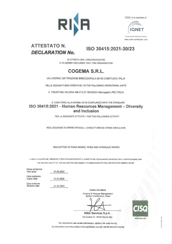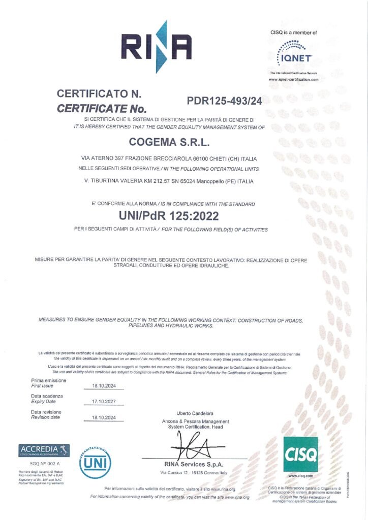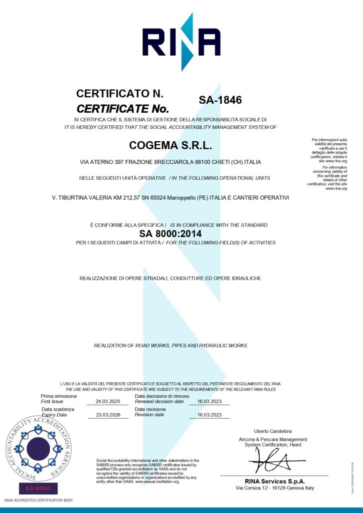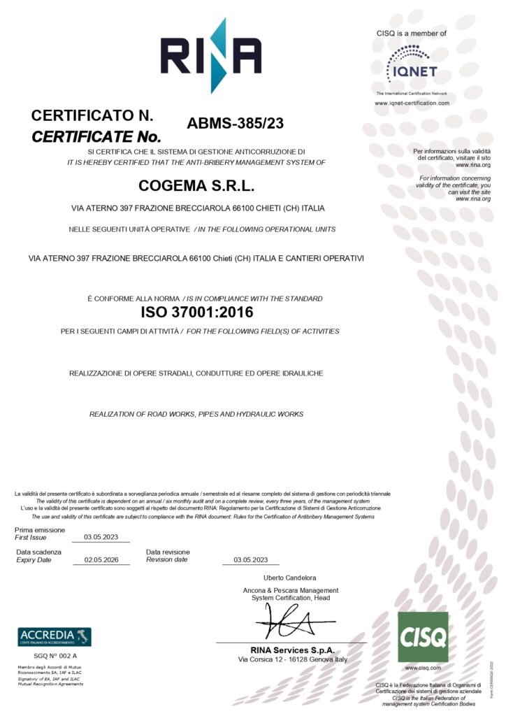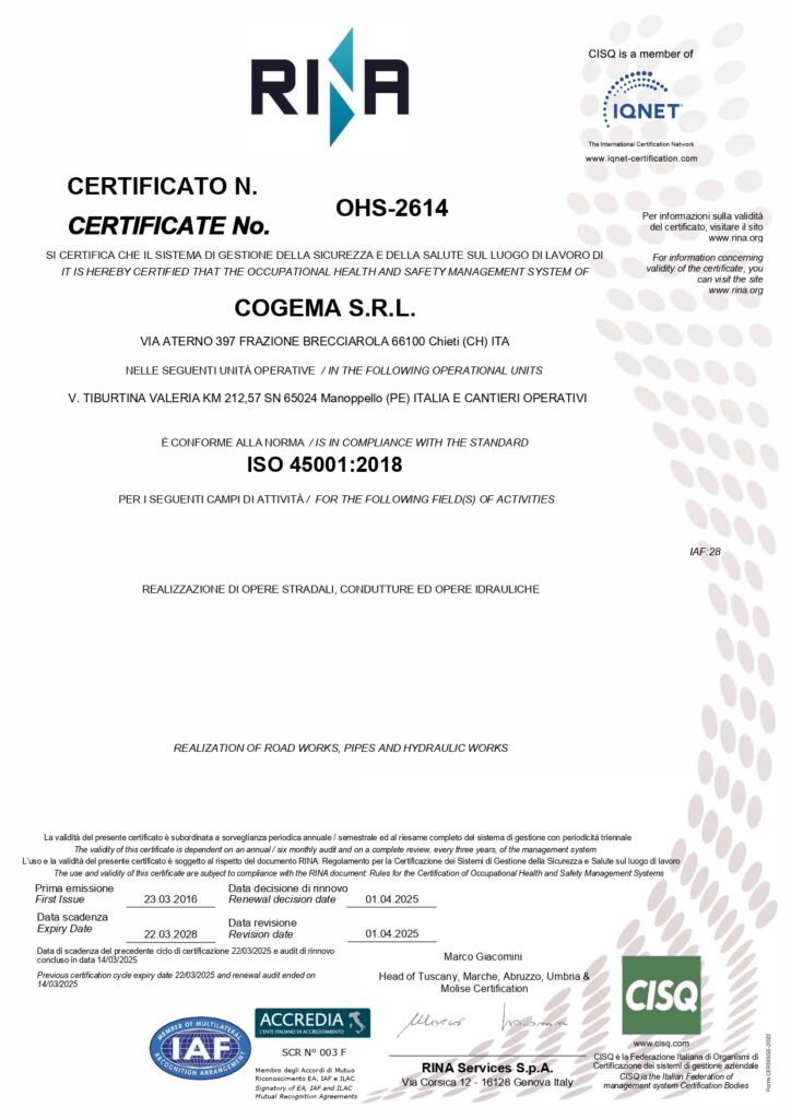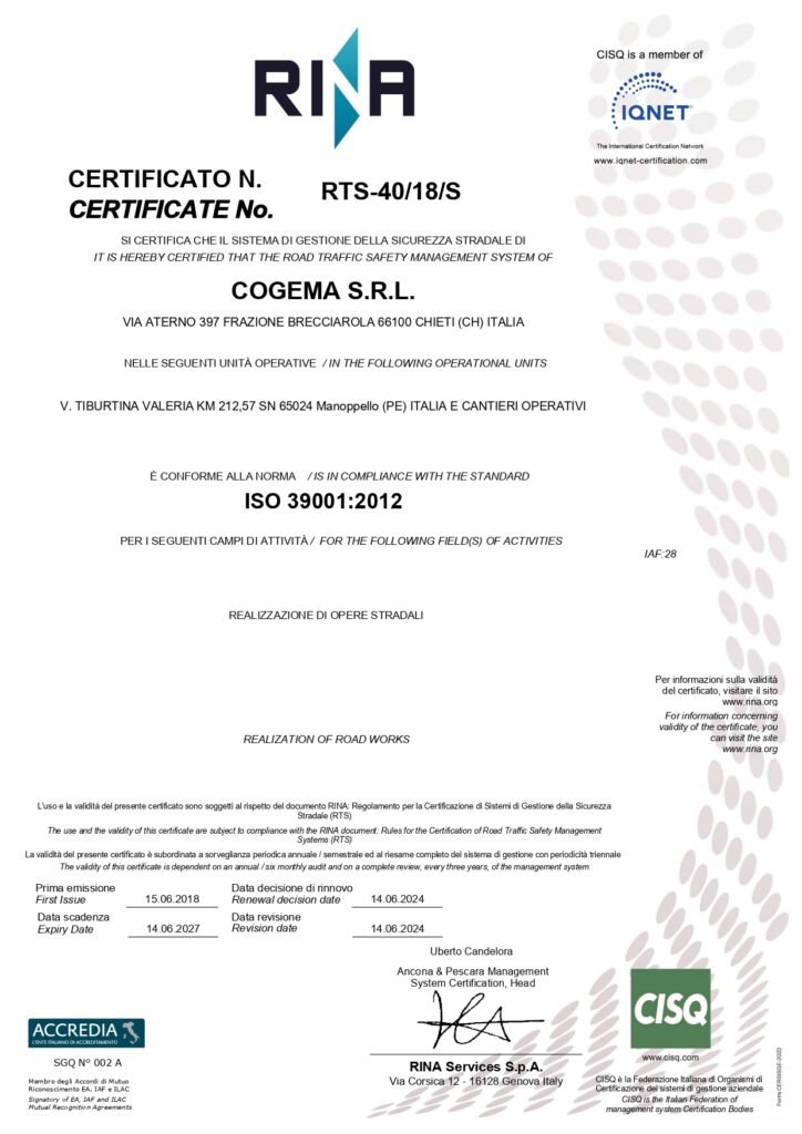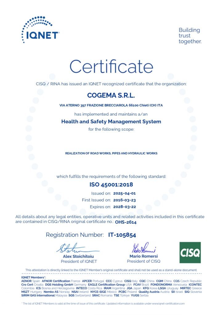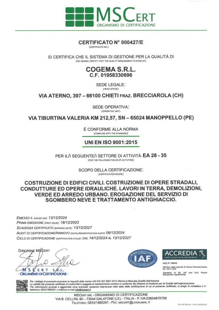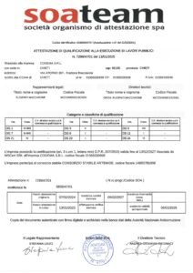 Tali competenze sono state nel tempo convalidate e riconosciute da istituti accreditati che attualmente certificano l’azienda nelle categorie SOA OG1, OG3 e OG6 che, con le rispettabili classifiche ottenute negli anni, sono il punto di forza della nostra azienda nei lavori infrastrutturali, edili ed industriali nonché nel consolidamento dei terreni e dei versanti, nelle opere stradali e nella realizzazione di acquedotti e fognature.